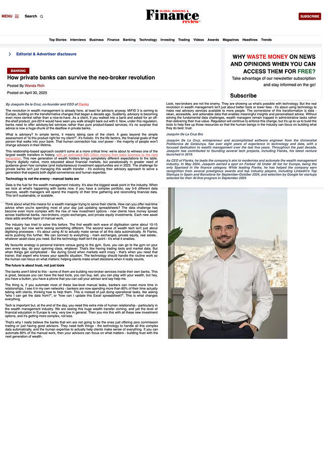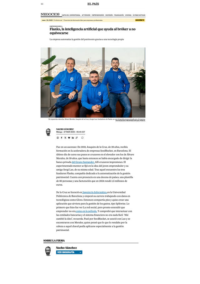 Flanks is a Barcelona-based wealth management tech company transforming complex financial data into clear, actionable insights. To support their growing PR presence, we created a series of professional portraits and group photos—shot both in studio and at their office with stunning views over Barcelona. I photographed every co-founder and C-level executive, capturing the dynamic, approachable spirit that sets Flanks apart. Since then, these images have appeared in major Spanish outlets like El País and specialized financial publications, reinforcing Flanks’ reputation as trusted, innovative leaders in wealth management—both in print and online.