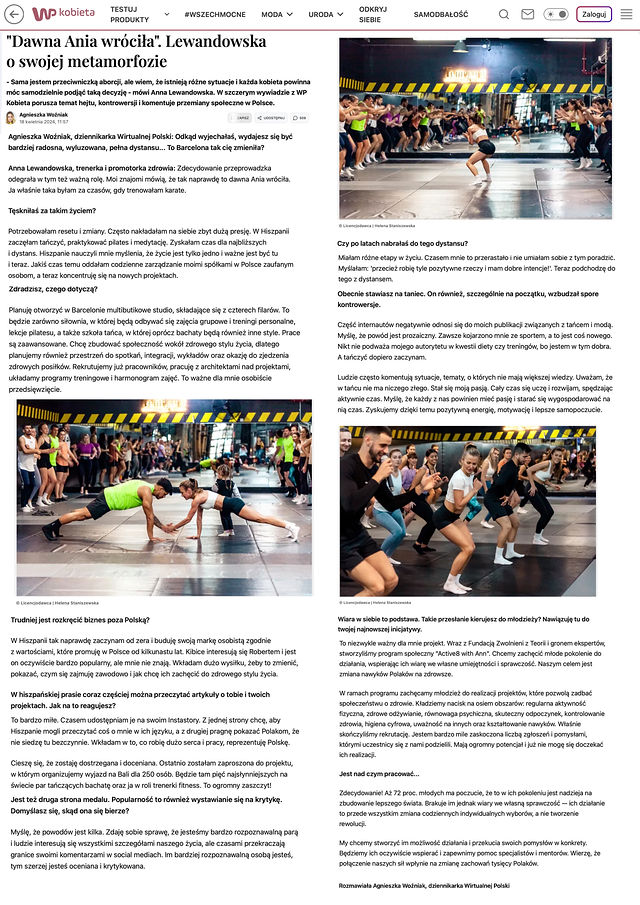 These images reveal Anna Lewandowska in her element — leading, inspiring, and training with her community. Shot for a feature on kobieta.wp.pl, the photos showcase the dynamic energy and connection between Anna and her trainees, embodying strength and enthusiasm. At the time, Anna was laying the groundwork for new projects in Barcelona, focusing fully on empowering women through fitness, nutrition, and wellness. The photos reflect the passion and unstoppable spirit that fuels her ongoing journey.